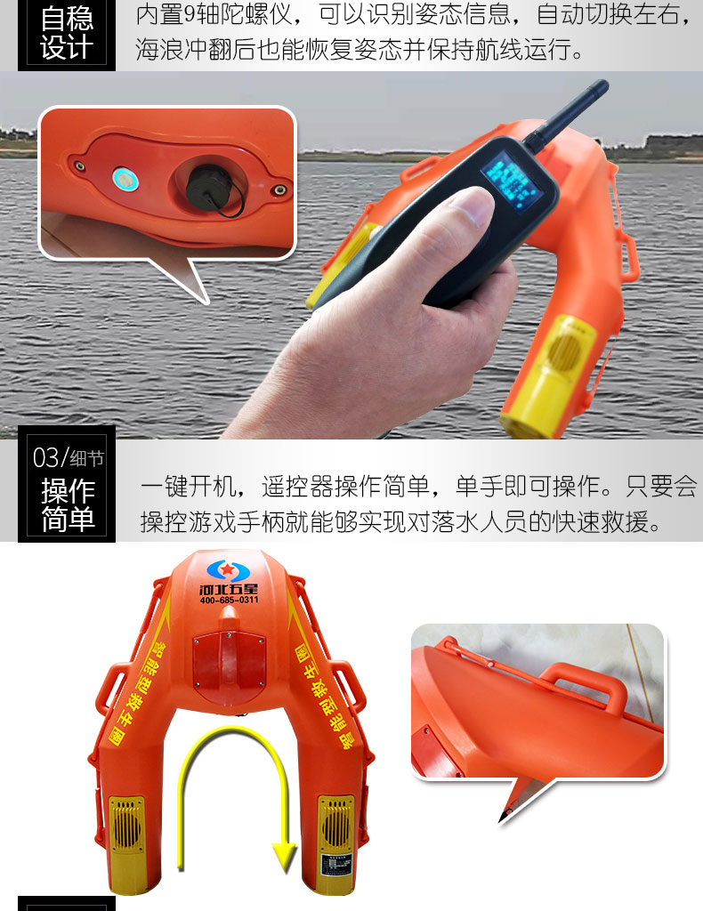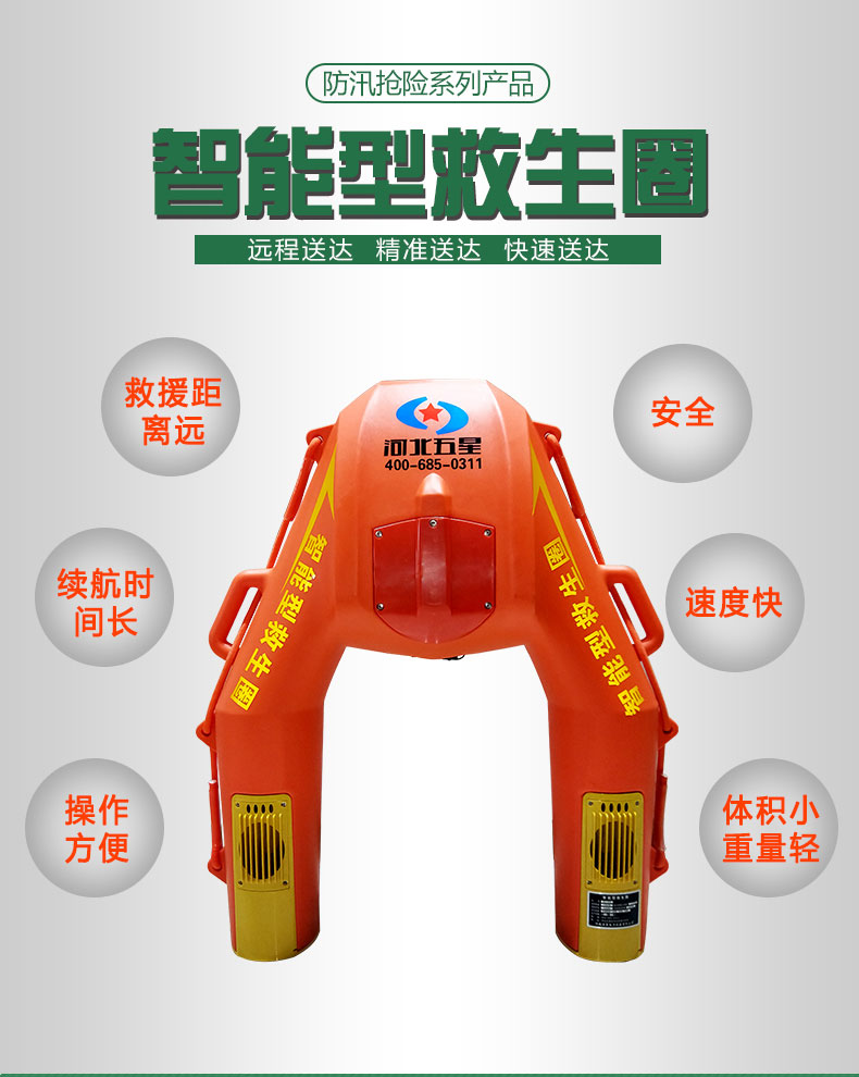 河北五星“霸王龍”WX-500型水上救生遙控機(jī)器人(智能型救生圈、智能型遙控救生圈)用于落水人員的救援,時速可達(dá)4米/秒,一旦碰到險情,會以很快的速度來到你身邊。智能型救生圈操作簡單,只要會操控游戲手柄就能夠?qū)崿F(xiàn)遠(yuǎn)距離、快速、精準(zhǔn)送達(dá),實現(xiàn)對落水人員的快速救援。