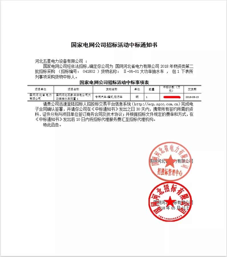 國(guó)家電網(wǎng)公司經(jīng)依法招標(biāo),確定河北五星公司為國(guó)網(wǎng)河北省電力有限公司“”2018 年物資類第二批招標(biāo)采購(gòu) (招標(biāo)編號(hào): 041802 )”項(xiàng)目中,河北五星研制生產(chǎn)的“大流量應(yīng)急搶險(xiǎn)排澇車”一舉中標(biāo)??!
